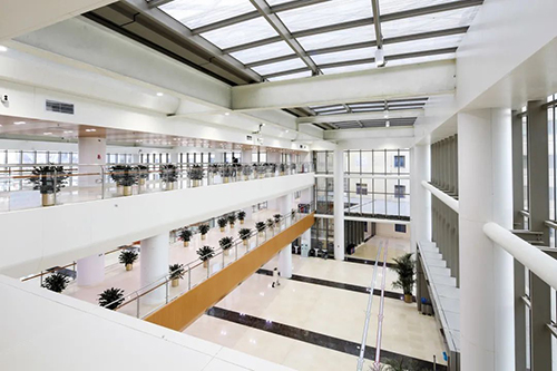 二期工程的門診大廳位于一期主體建筑與二期主體建筑之間,通過一層的大廳以及二層、三層的連廊將南側的一期建筑和北側的二期建筑連為一體。大廳采用的是鋼結構建筑方法,東西兩側均為玻璃立面,頂棚采用了玻璃采光頂,內(nèi)部為三層高的中庭式設計,使得大廳空間尺度寬闊,并且可以充分利用自然光。